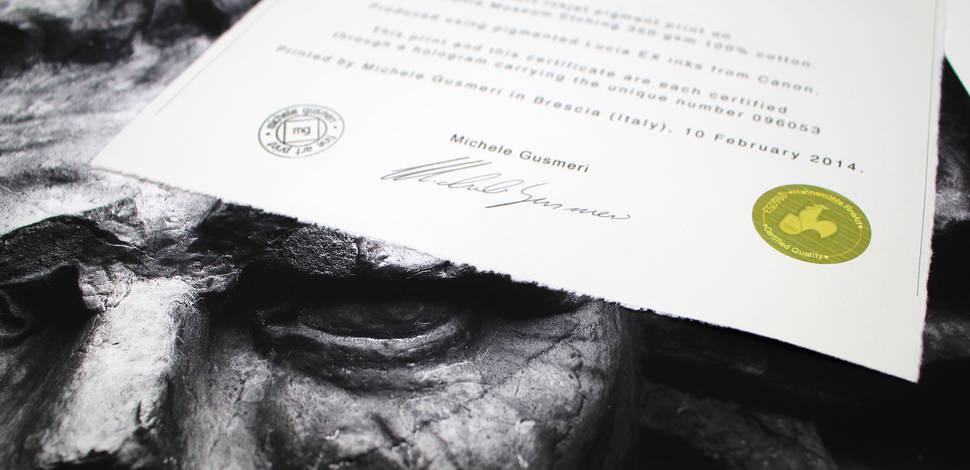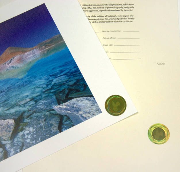 Each certificate is made of premium deckle edged mould made paper with a Hahnemühle watermark and fluorescent security fibres. A serialized numbered hologram should be added. A second, identically numbered hologram should then be applied to the reverse side of the artwork.