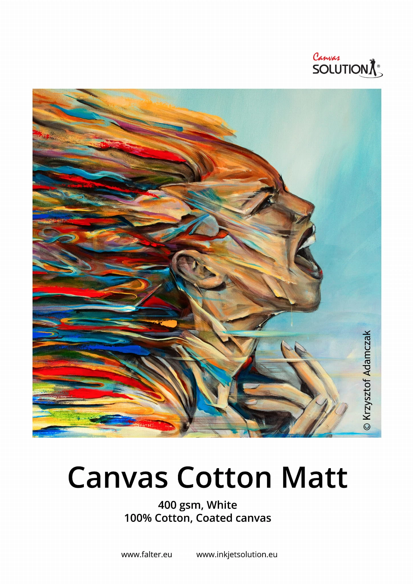 Solution Canvas Cotton Matt 400 to wysokiej jakości, wykonane w 100% z bawełny, matowe płótno do zastosowania w drukarkach atramentowych. Płótno posiada matową powierzchnię o ciepłym białym odcieniu oraz widoczną teksturę. Solution Canvas Cotton Matt 400 to płótno, które dzięki wysokiej jakości powłoce, wiernie oddaje kolorystykę drukowanych prac, dzięki temu doskonale nadaje się do wydruku zdjęć, reprodukcji obrazów i dzieł sztuki.